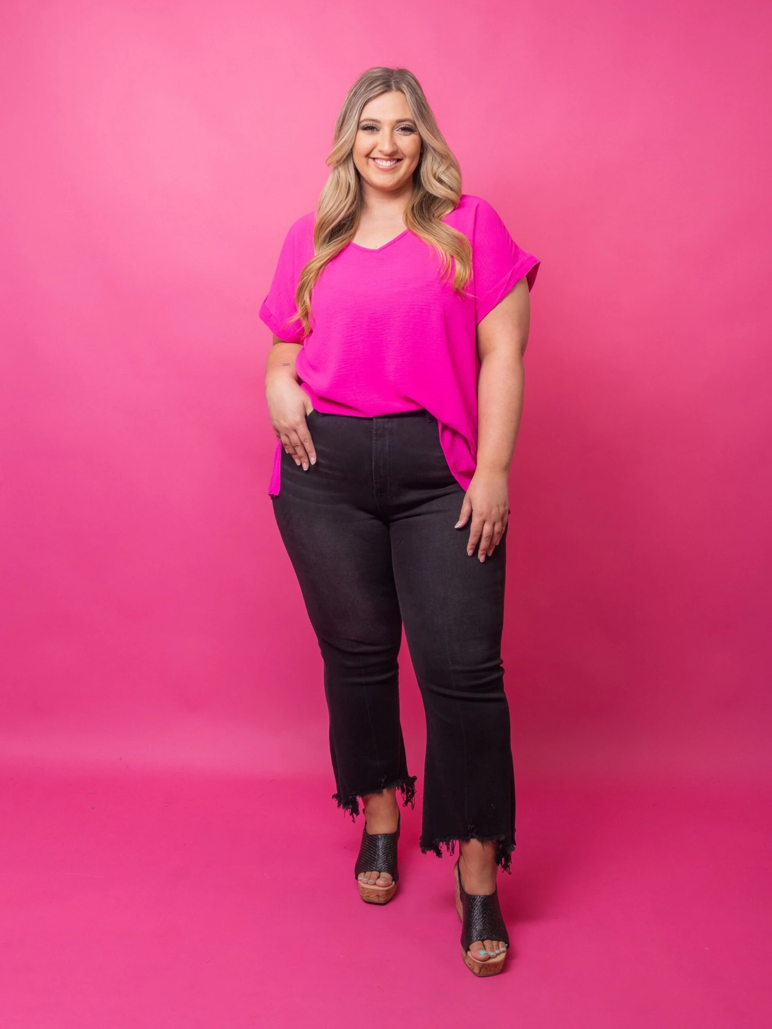 Erin is 5’9, 36C bra, typically wears size L/XL in tops and 14/16 in denim. Wearing size 1X
