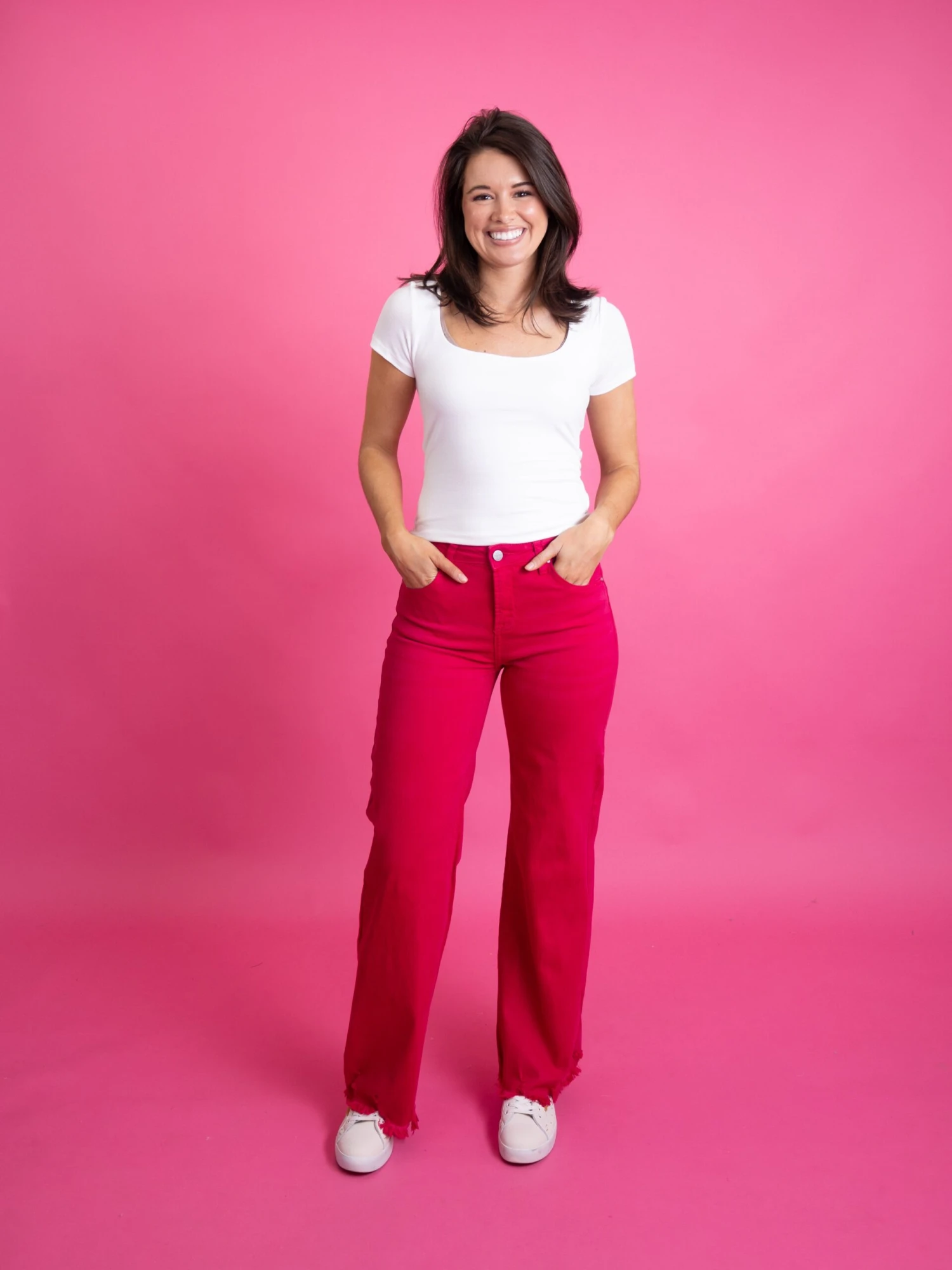 Do you see the frayed hem and this gorgeous COLOR?! Those two details alone make the high rise jeans an automatic add to cart! Comfy! Vibrant! Flattering!