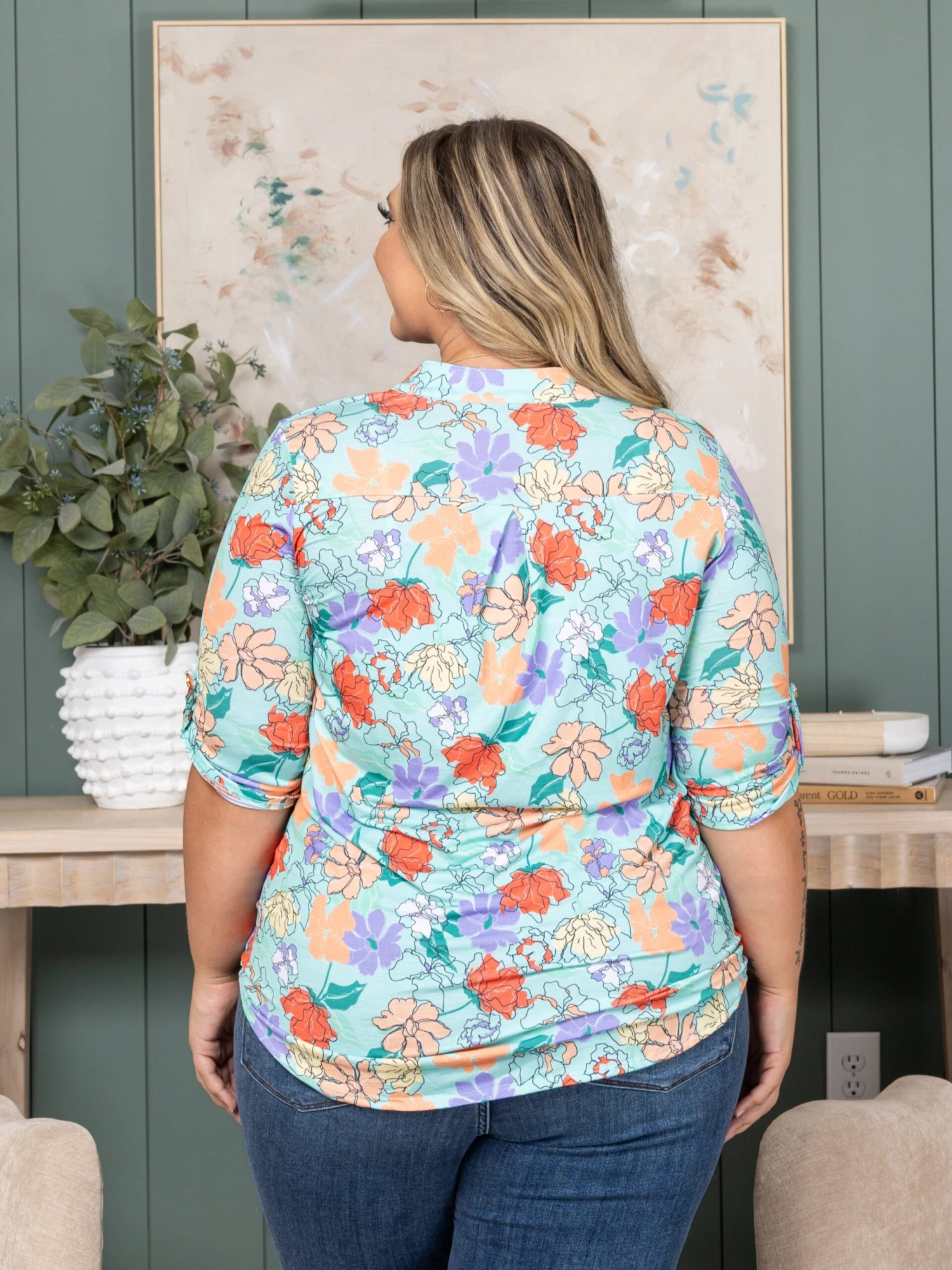 Features: Roll Up Button Sleeve Floral Hi Low Top