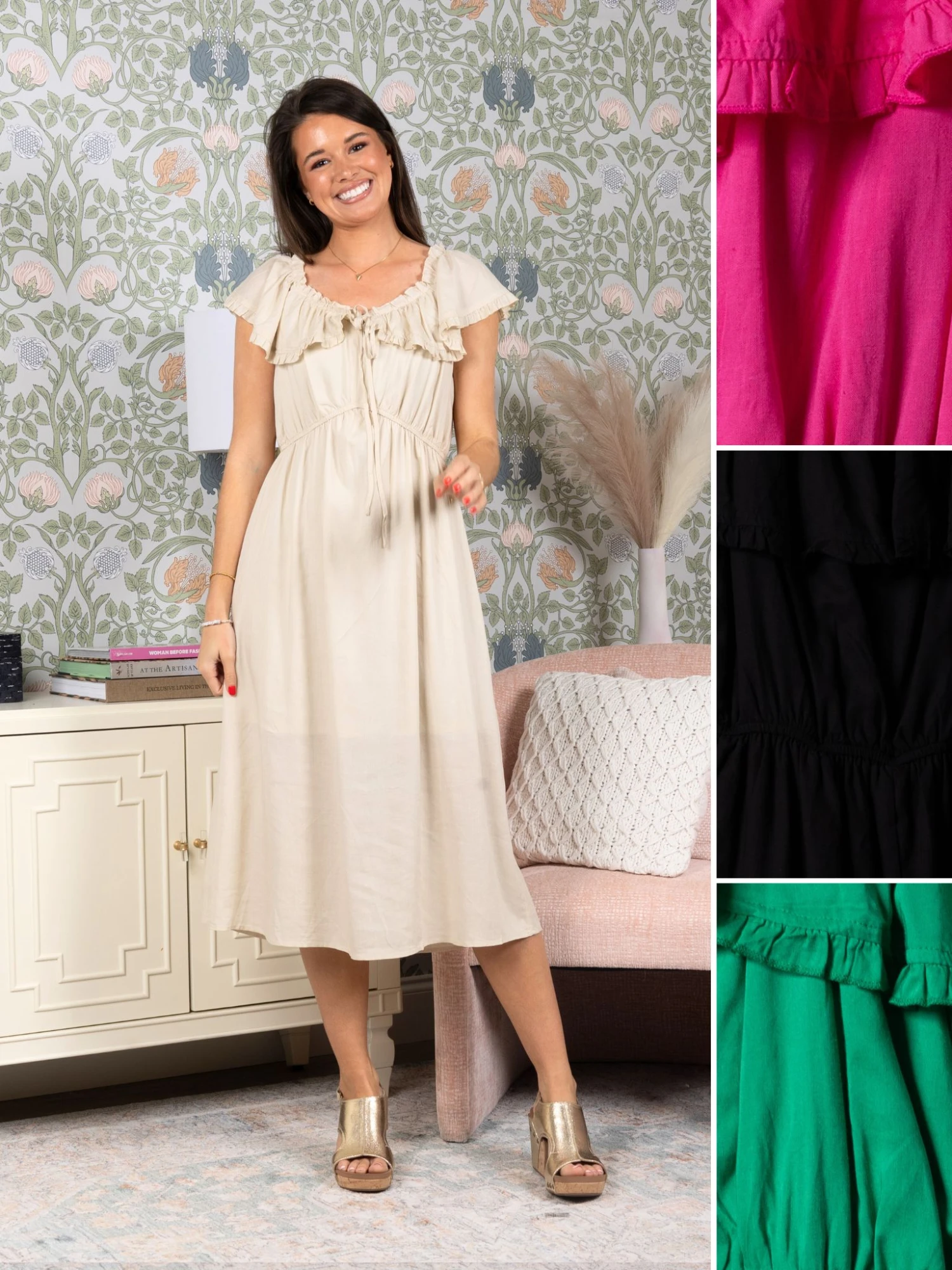 Features: Ruffle Sleeves, Lined, Pockets, Tied Scoop Neck