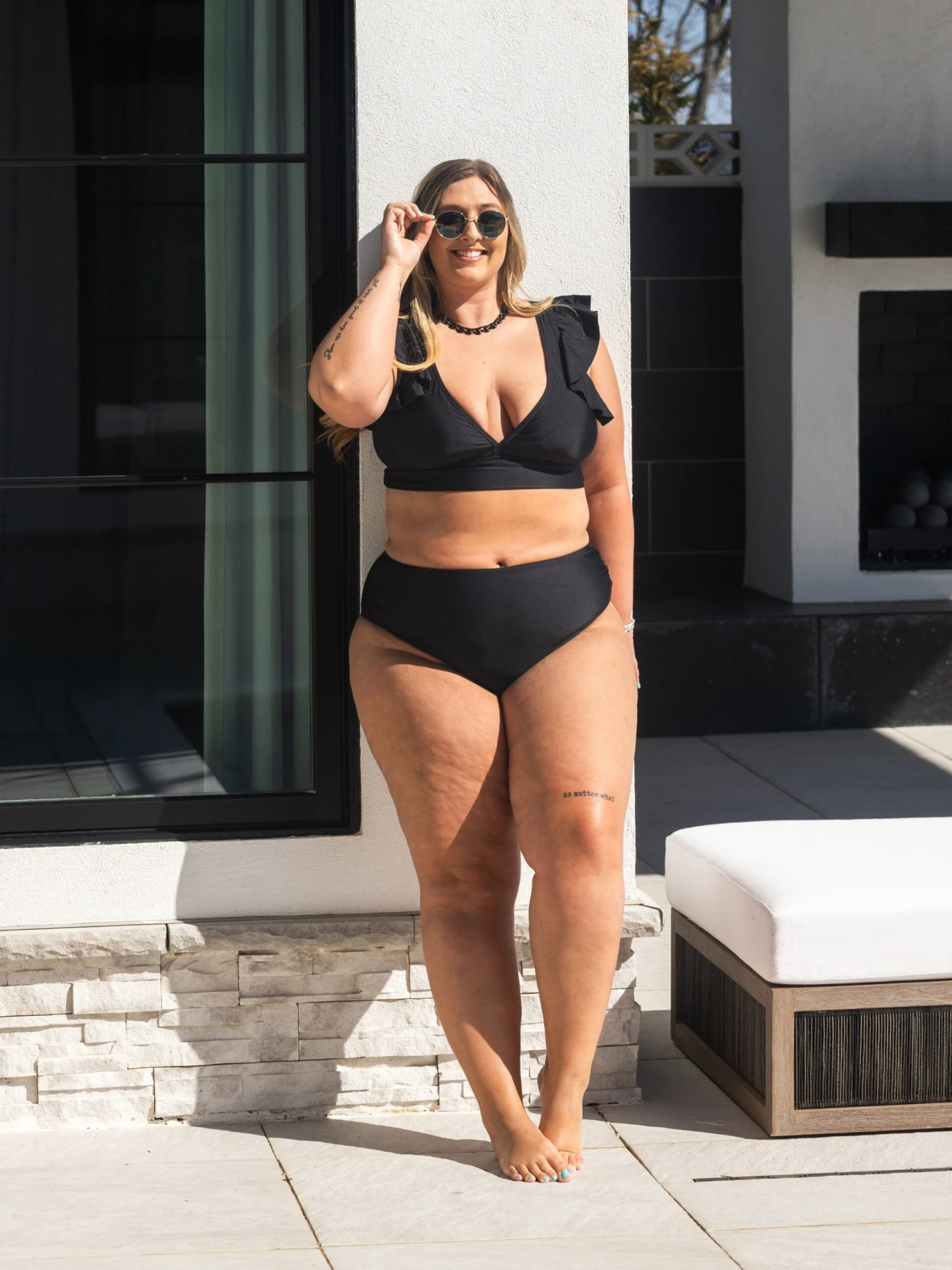 Erin is 5’9, 36C bra, typically wears size L/XL in tops and 14/16 in denim. Wearing size XL. This top is very flattering in the bust and the bottoms give great tummy control.