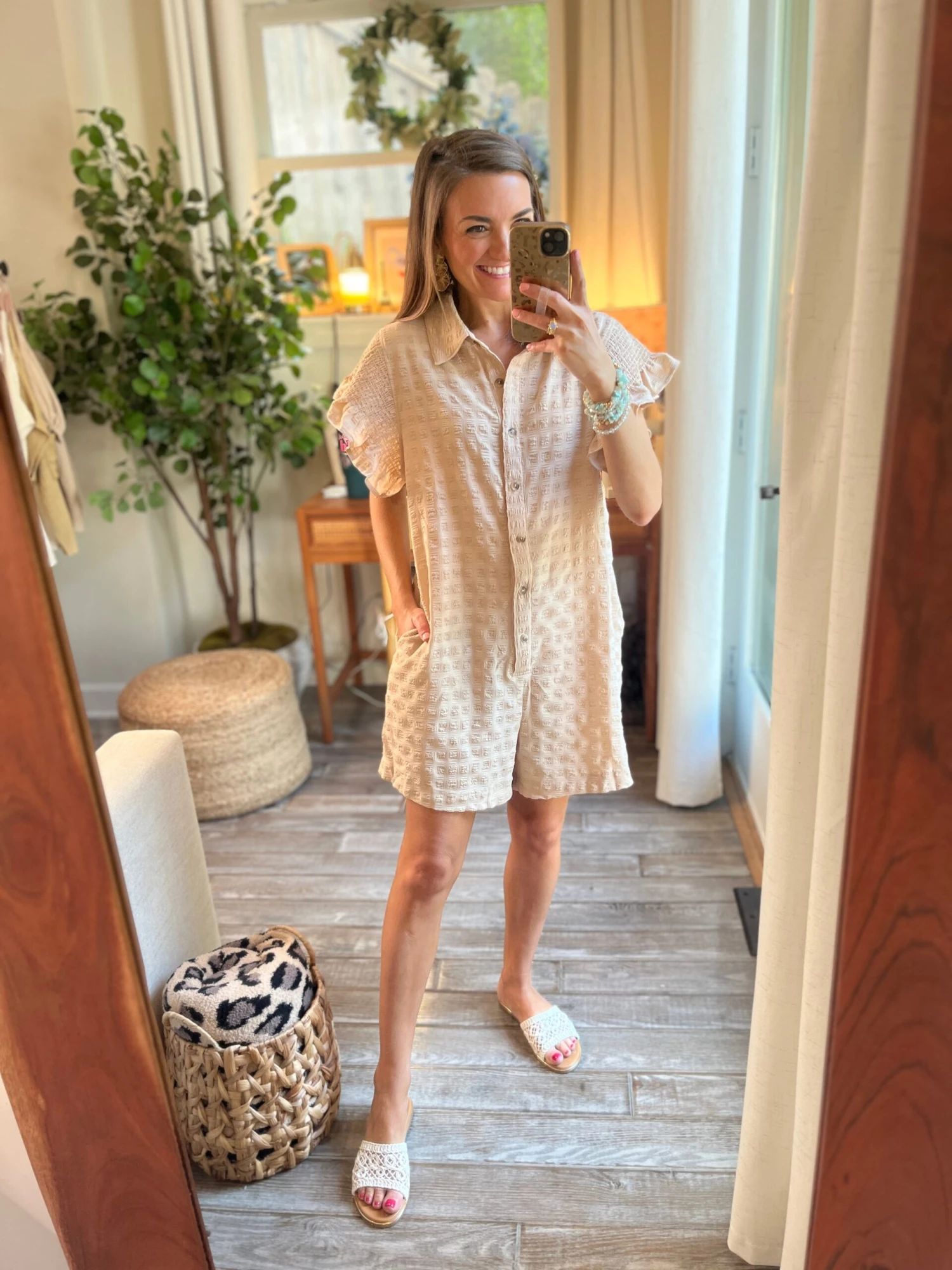 Features: Button Down, Collar, Ruffle Short Sleeve, Textured