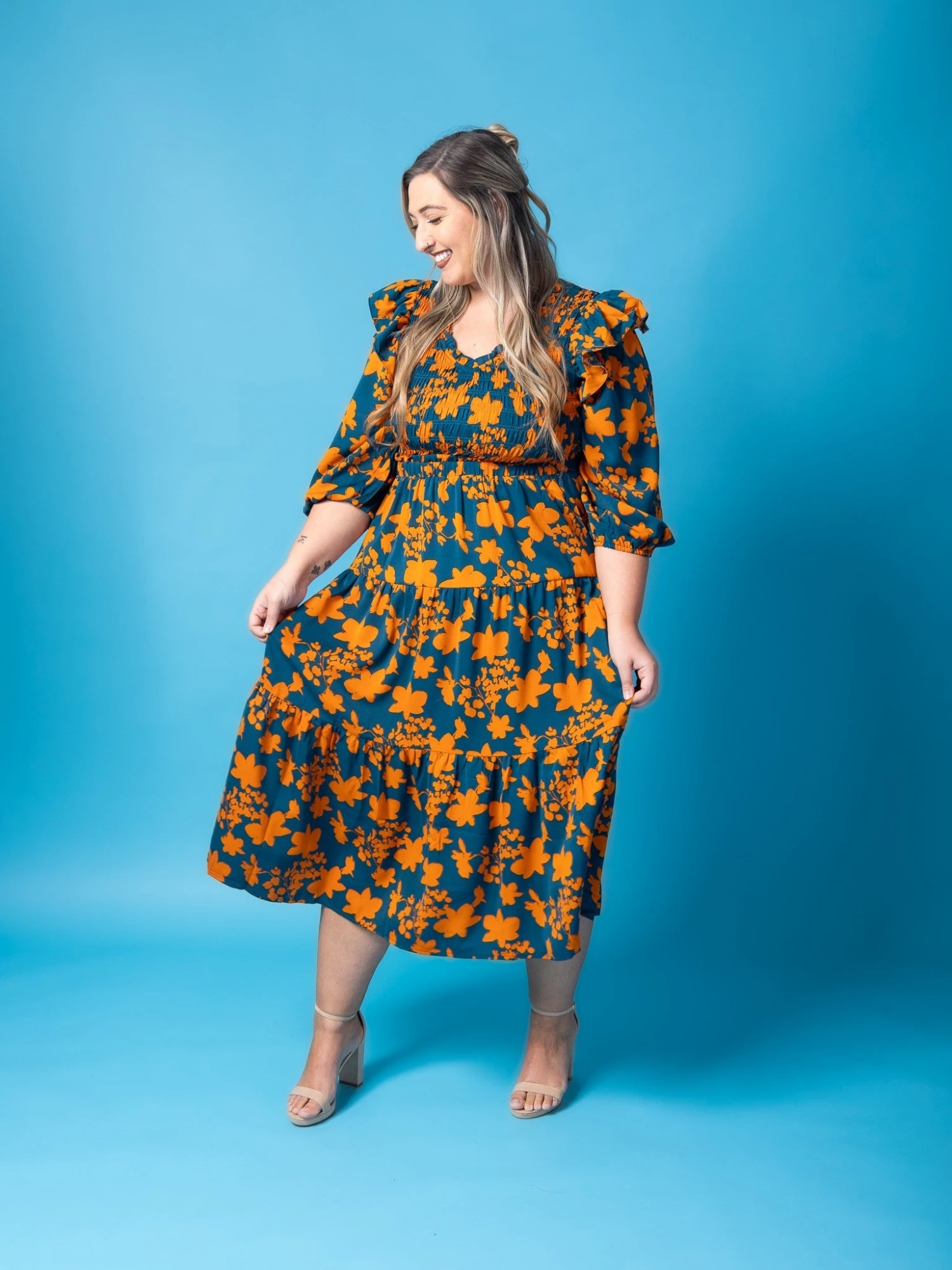 Features: 3/4 Sleeves, V Neck, Tiered, Smocked Bust, Print