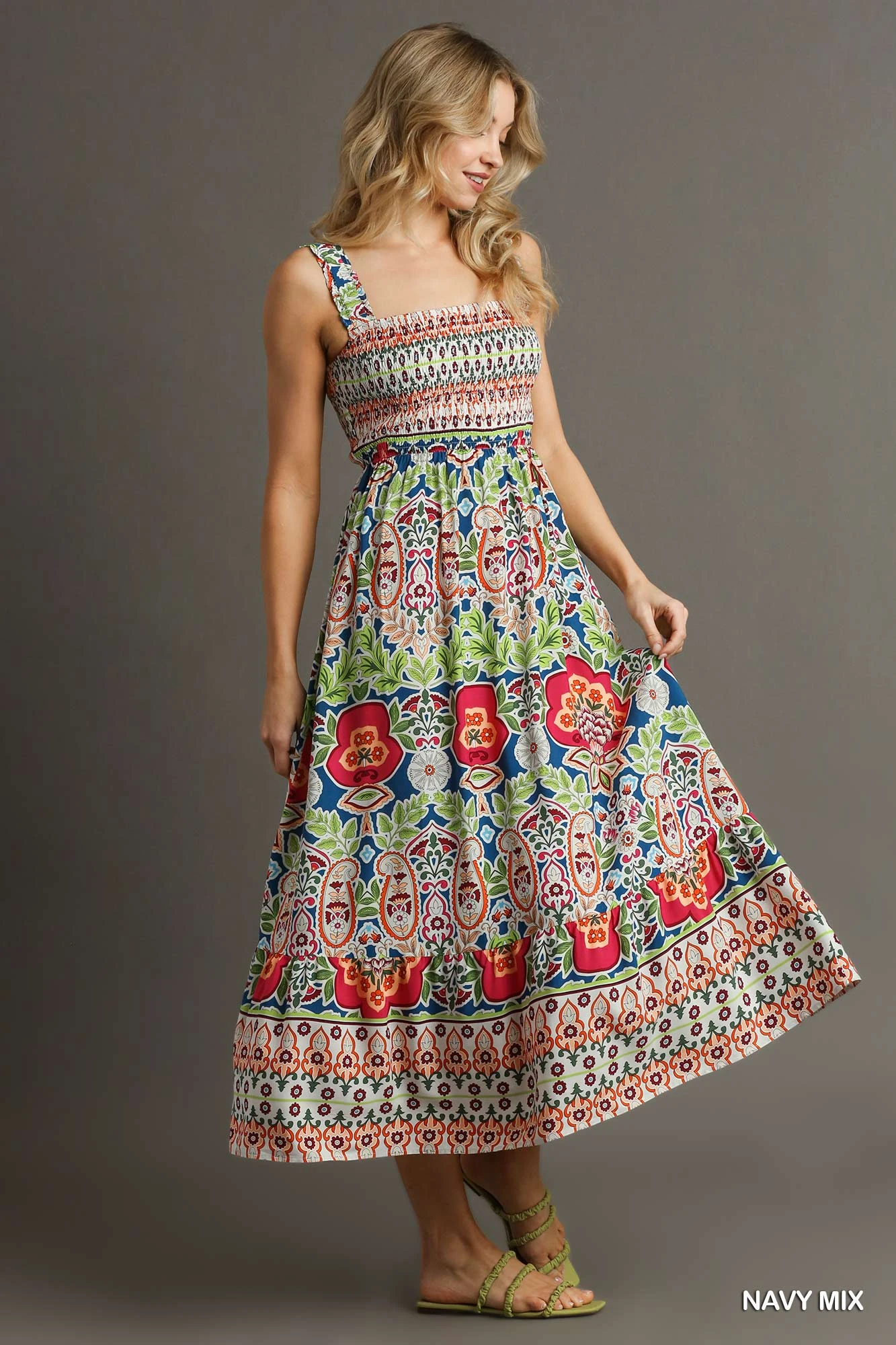 Features: Sleeveless, Square Neck, Smocked, Printed