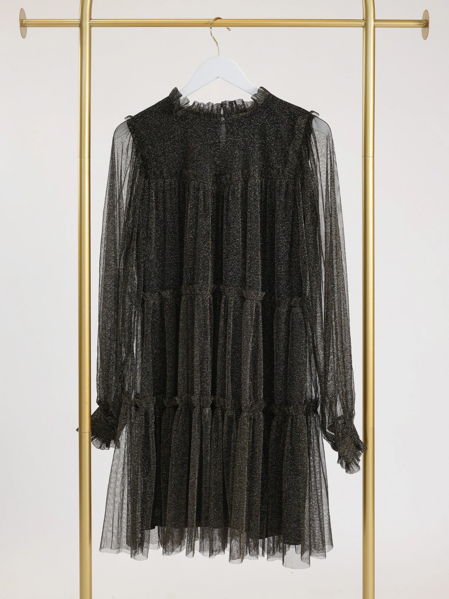 Features: Ruffle Mock Neck, Long Sleeves, Lined, Sparkly
