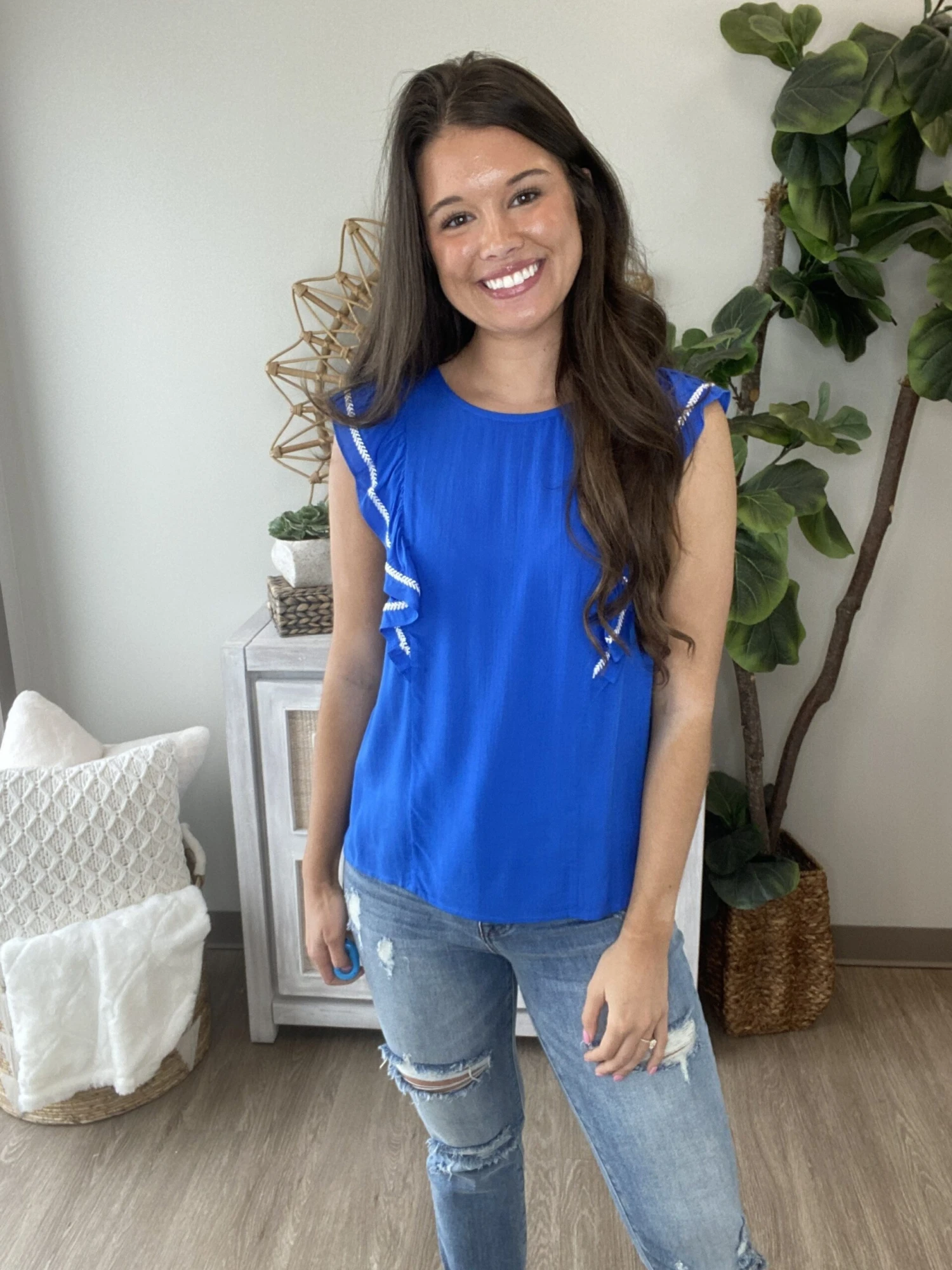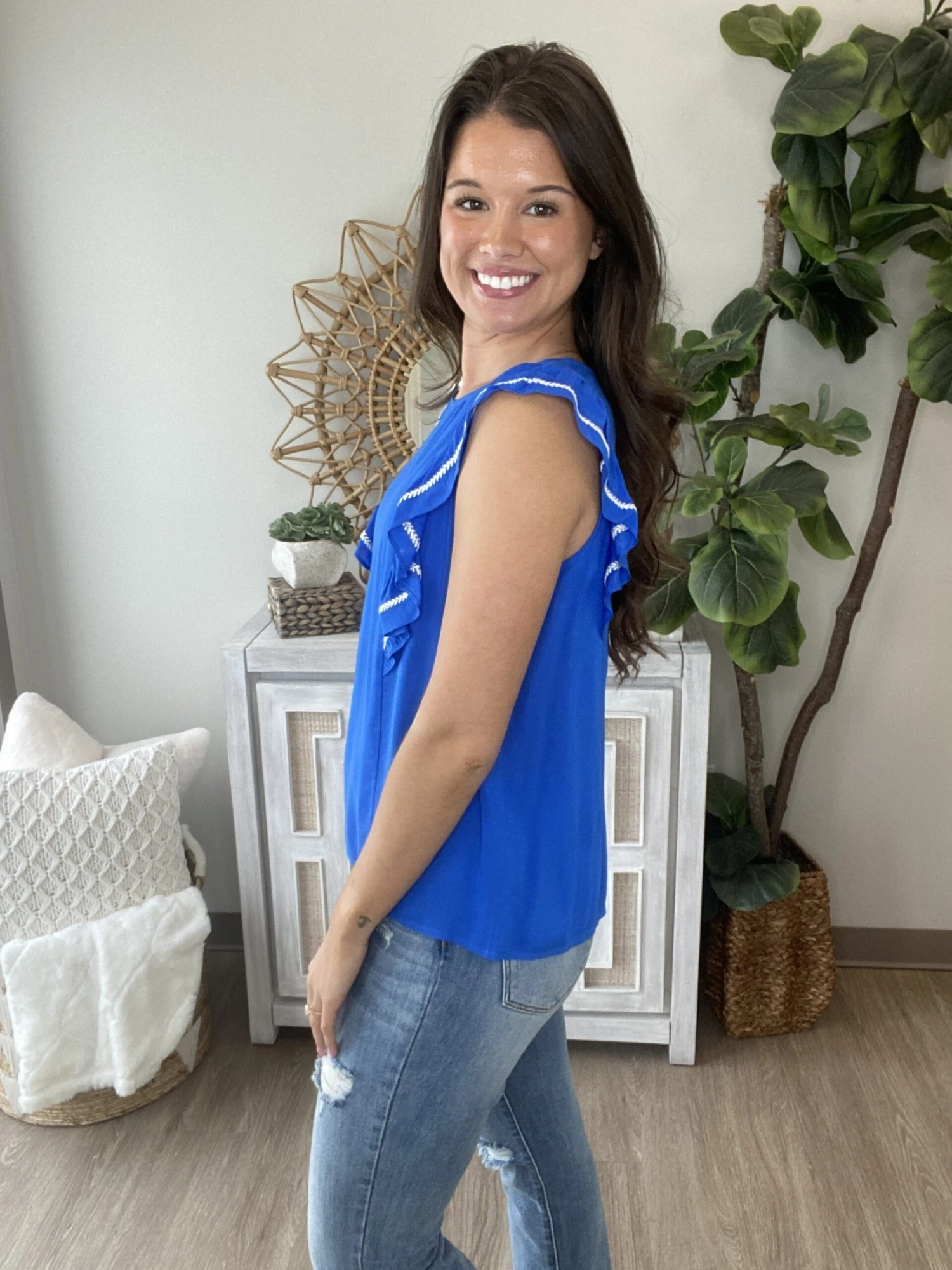 The “Getting Closer Top” has arrived! This ruffle sleeve top is a must have! With embroidery details, this one is a must have! Perfect for the spring or summer seasons, you cannot go wrong here! Snag one before they sell out!