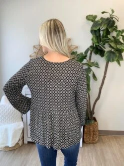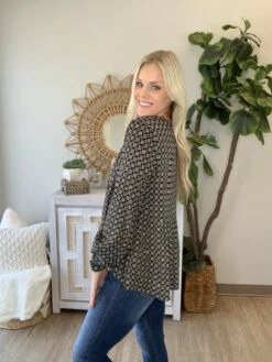 The “Start To Finish Top” has arrived! This super cute geometric print is to die for! The bubble sleeves are super classy! Be sure to snag one before they sell out!