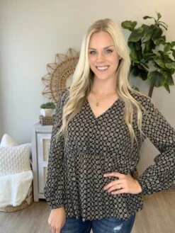 The “Start To Finish Top” has arrived! This super cute geometric print is to die for! The bubble sleeves are super classy! Be sure to snag one before they sell out!