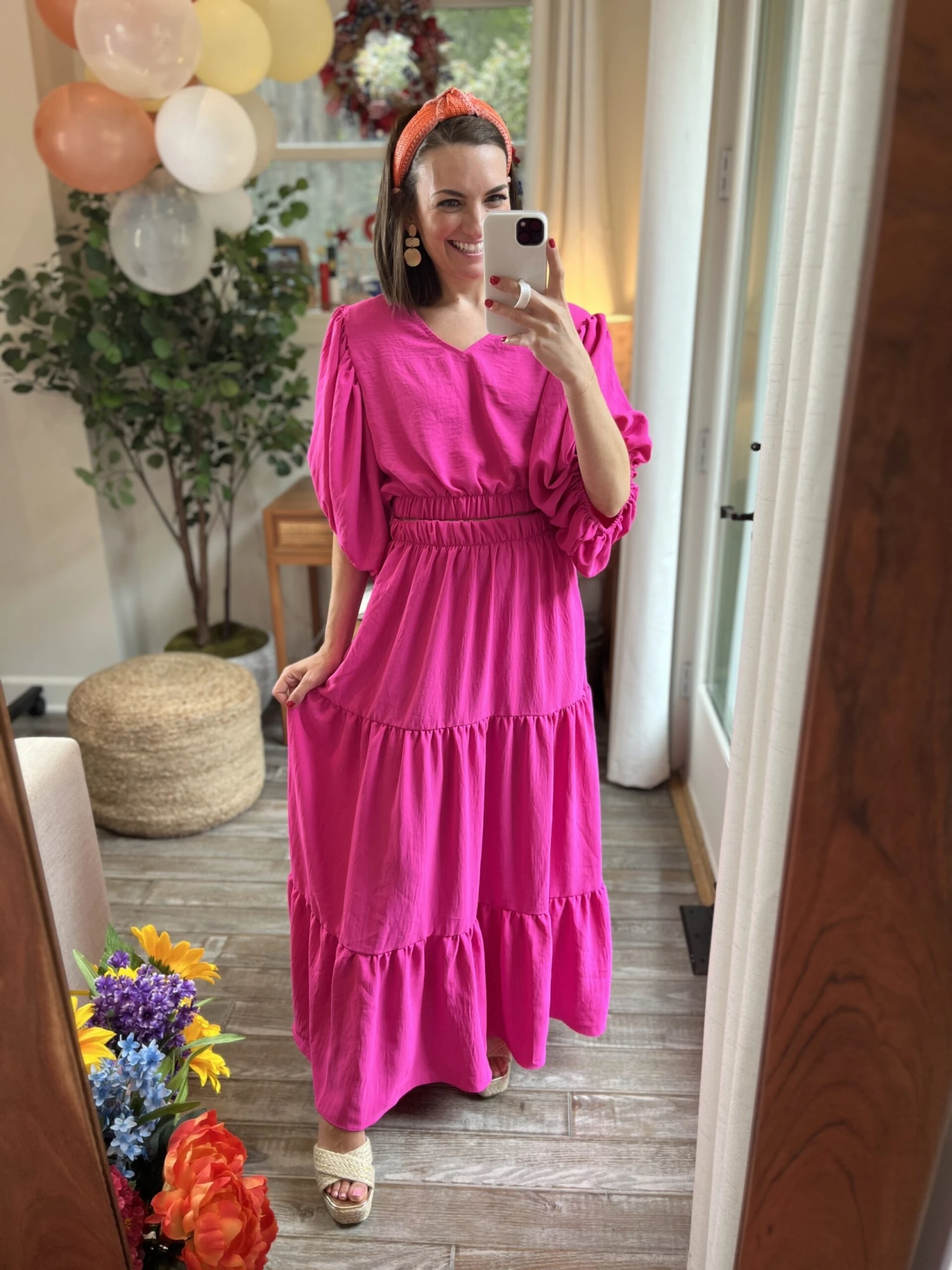 Features: 3/4 Puff Sleeves, V Neck, Elastic Waist