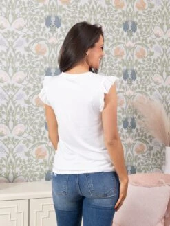 Features: Swiss Dot, Flutter Sleeves, Round Neck