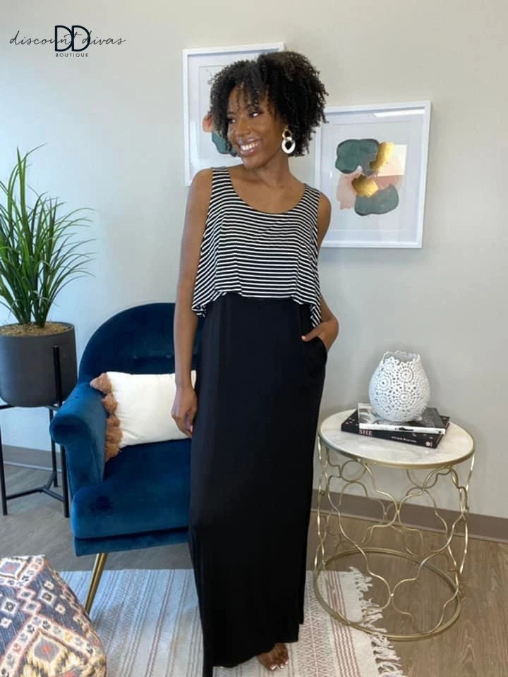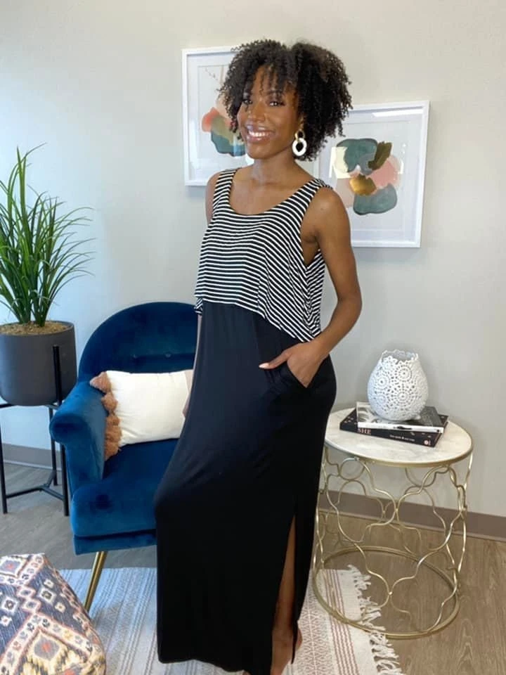 The “Take It In Dress” has arrived! This adorable maxi dress is a must-have! You can’t miss out on this classy dress with the stripes and solid black! Be sure to snag one before they are gone!