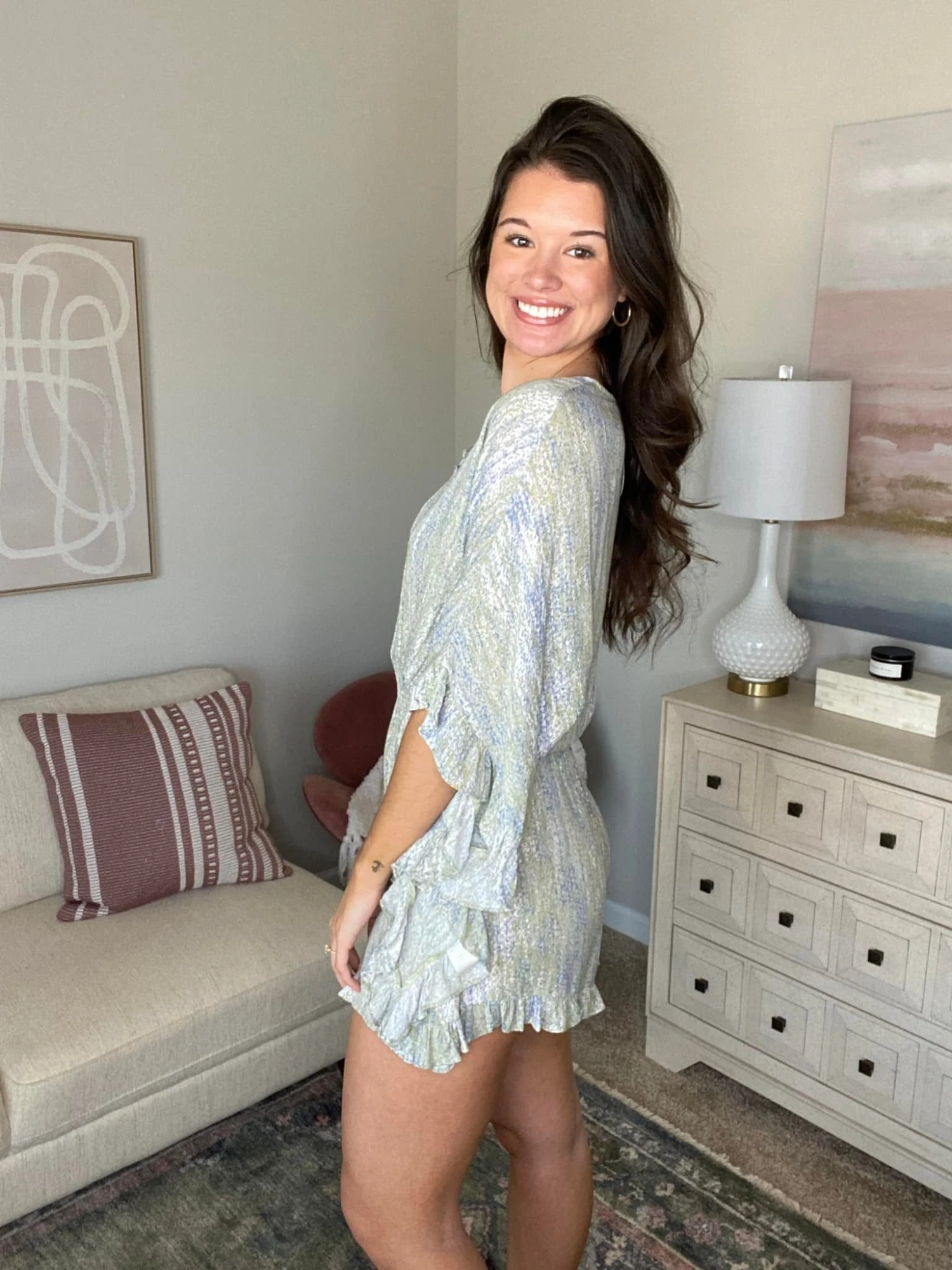 Features: printed, scoop neck, front summary down, smocked waist, dolman sleeves, kimono romper