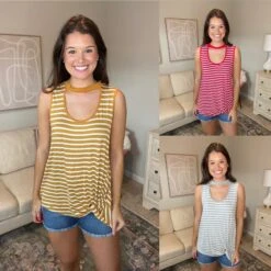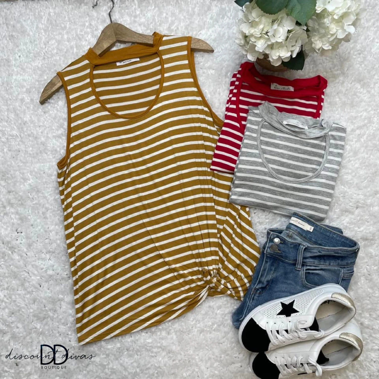 Features: Mock Neck, Sleeveless, Stripes, Front Twist Bottom