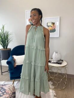 Features: round neck, sleeveless, back keyhole detail with tie, tiered hem