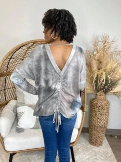 Features: tie dye print, v neck, open back w/ drawstring, long sleeve