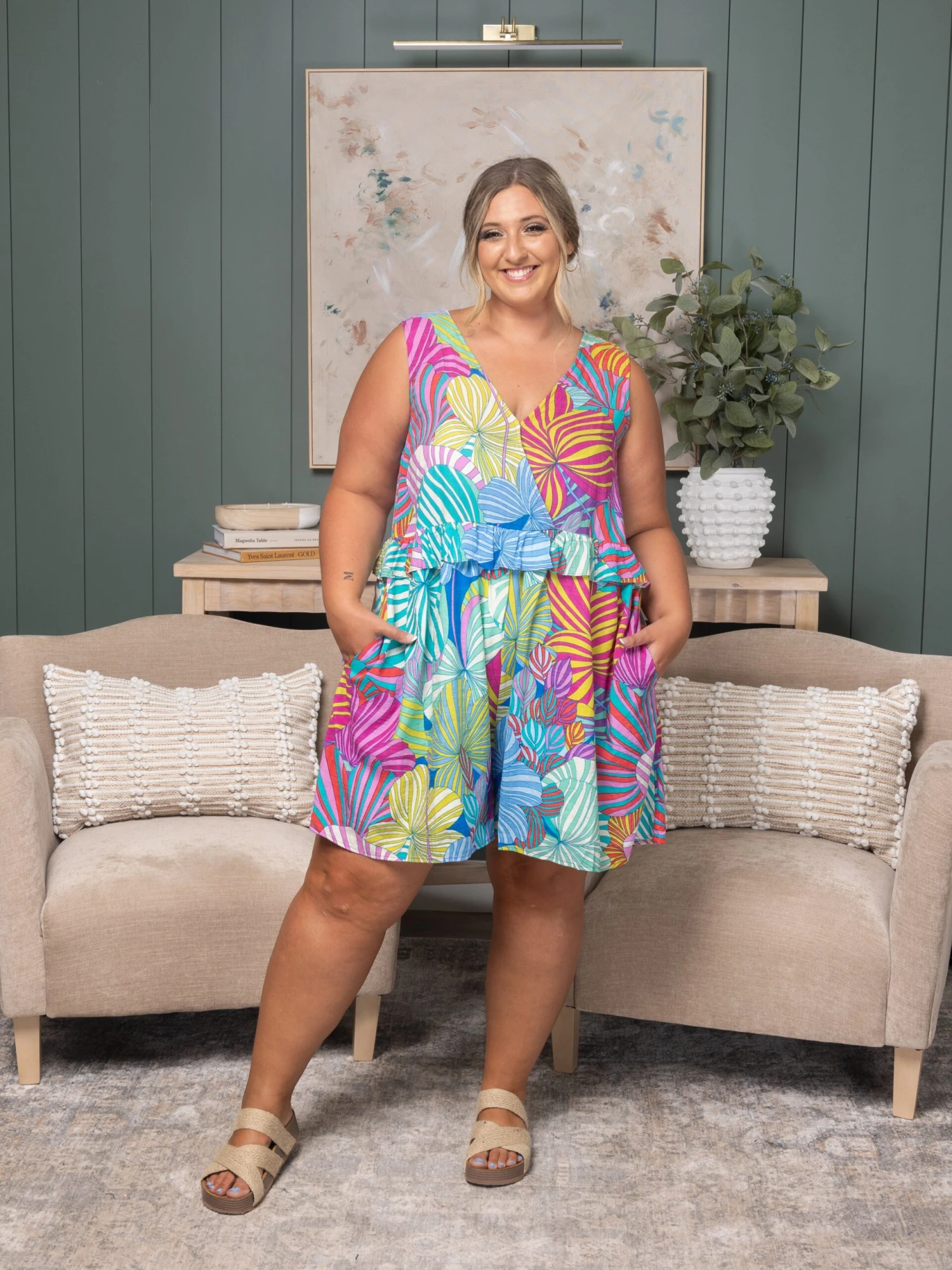 Features: V neck, Button and keyhole, Waist ruffle detail, Sleeveless