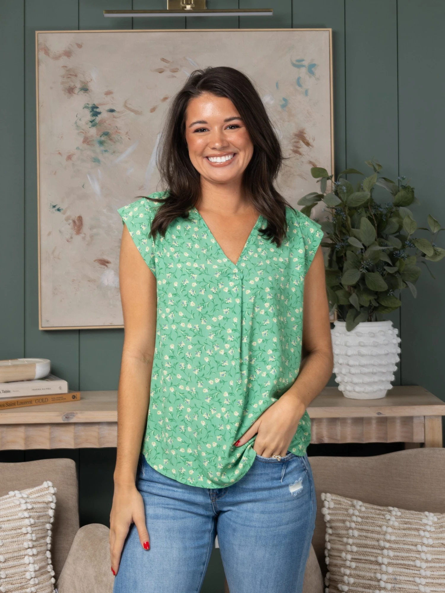 Features: Floral, V-neck & Short sleeve