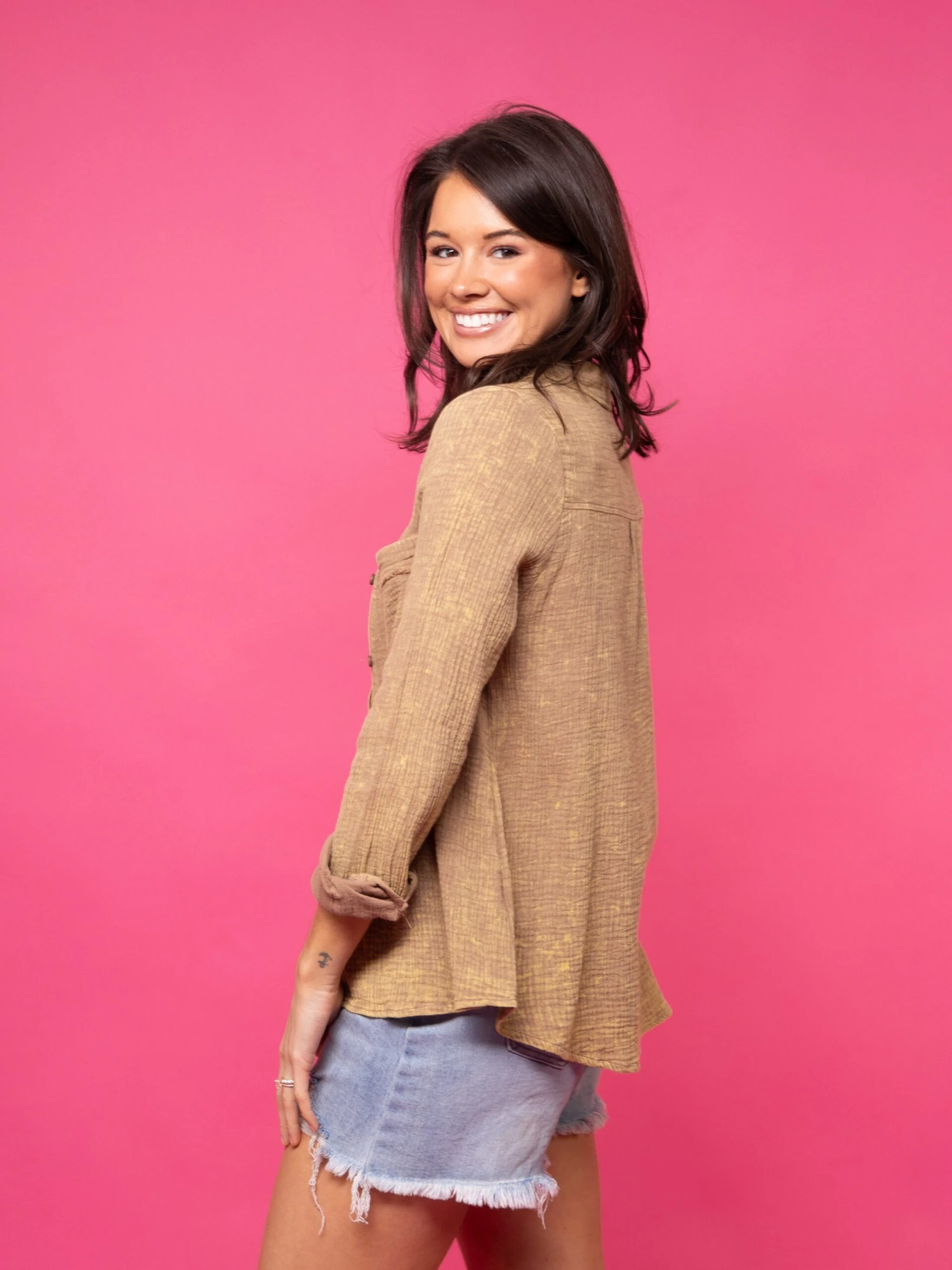 This versatile top features a relaxed fit and a crinkle gauze texture for a breezy and casual look! And the summary-down front makes it perfect for so many occasions!