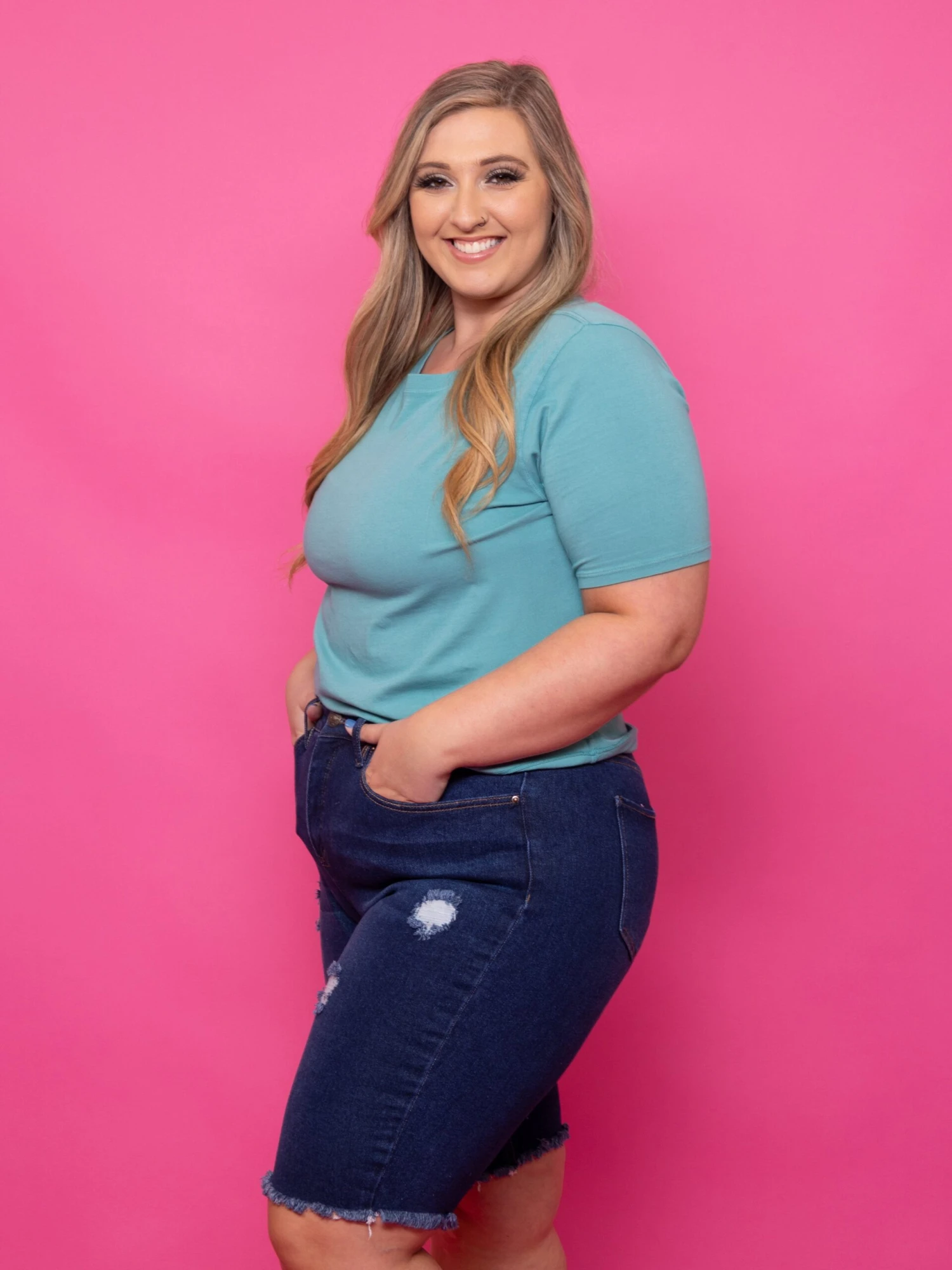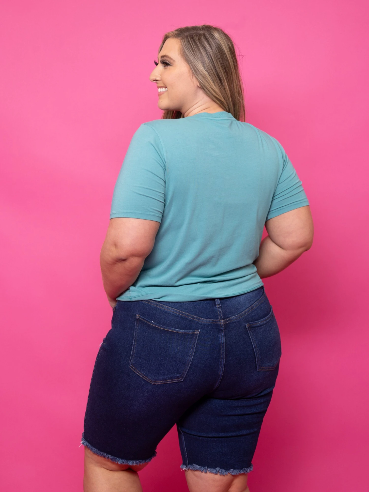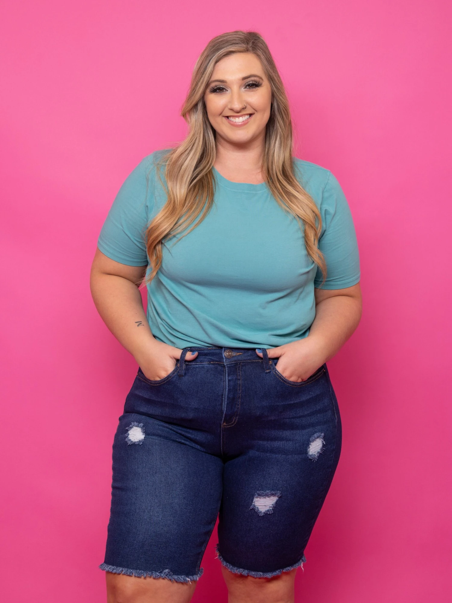 High-quality denim with the perfect wash and length, these Bermuda shorts offer a classic look while still being on trend! Plus, they’re so super cute!