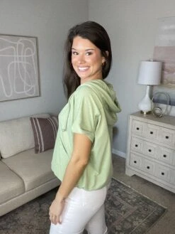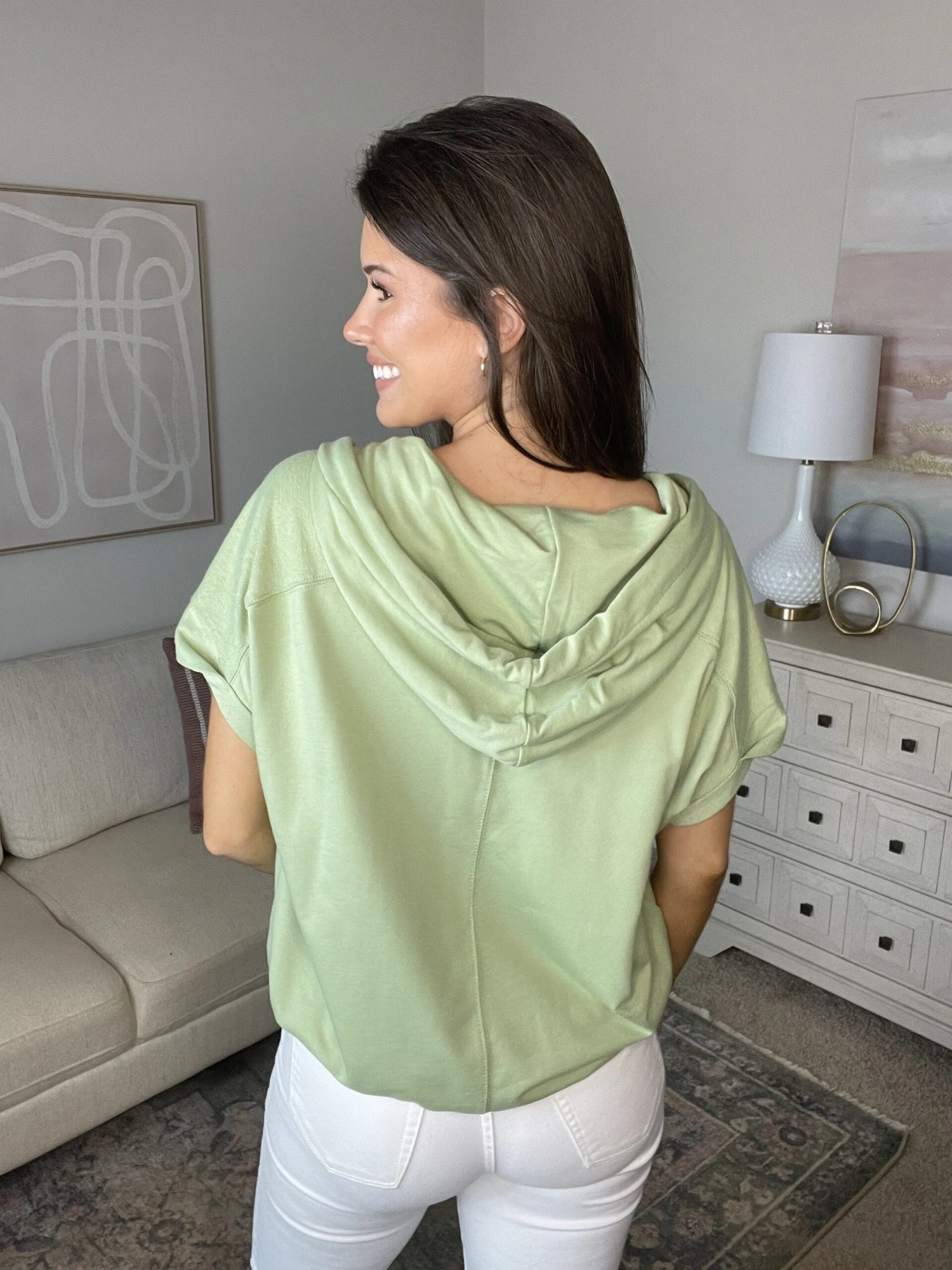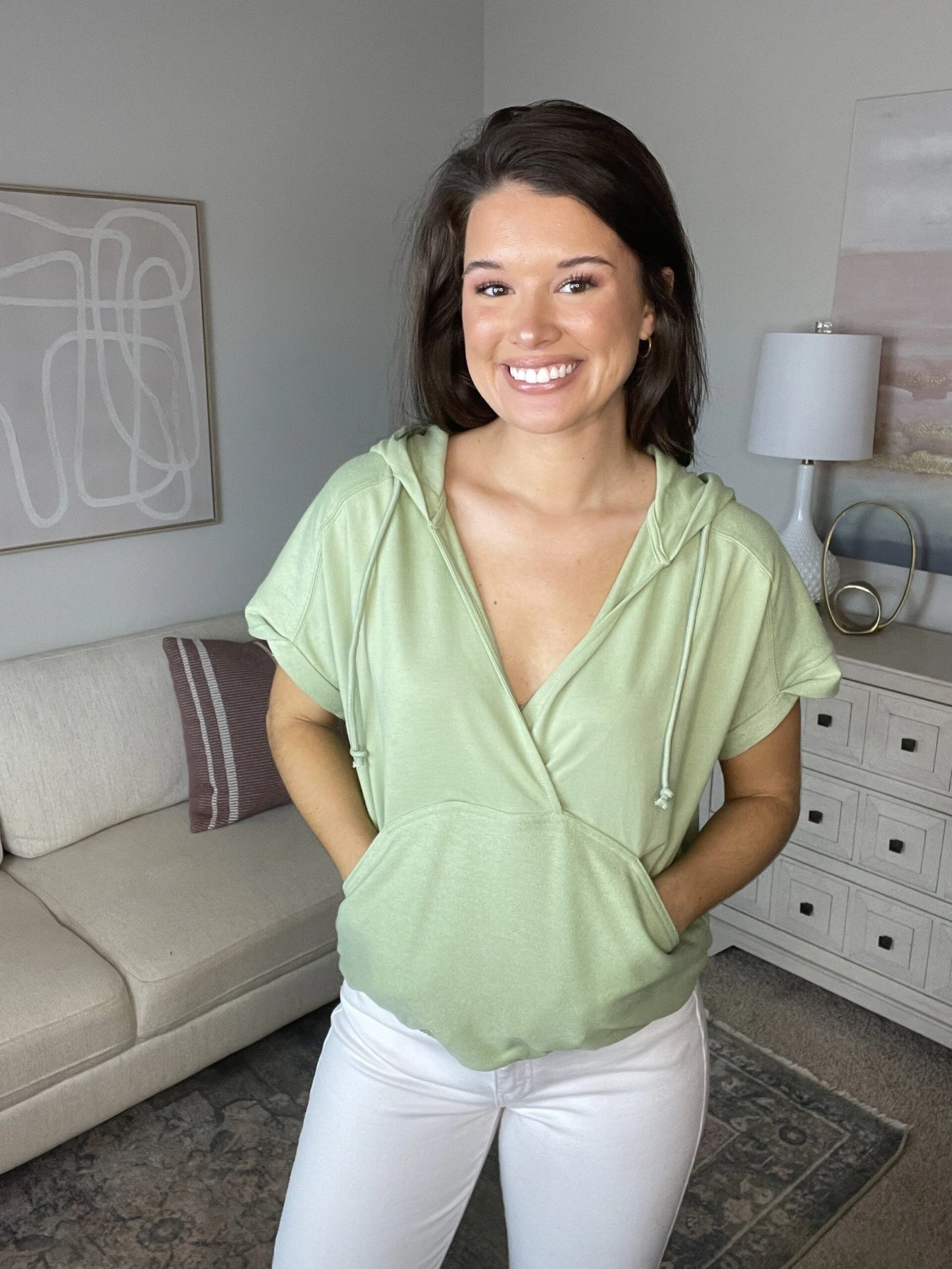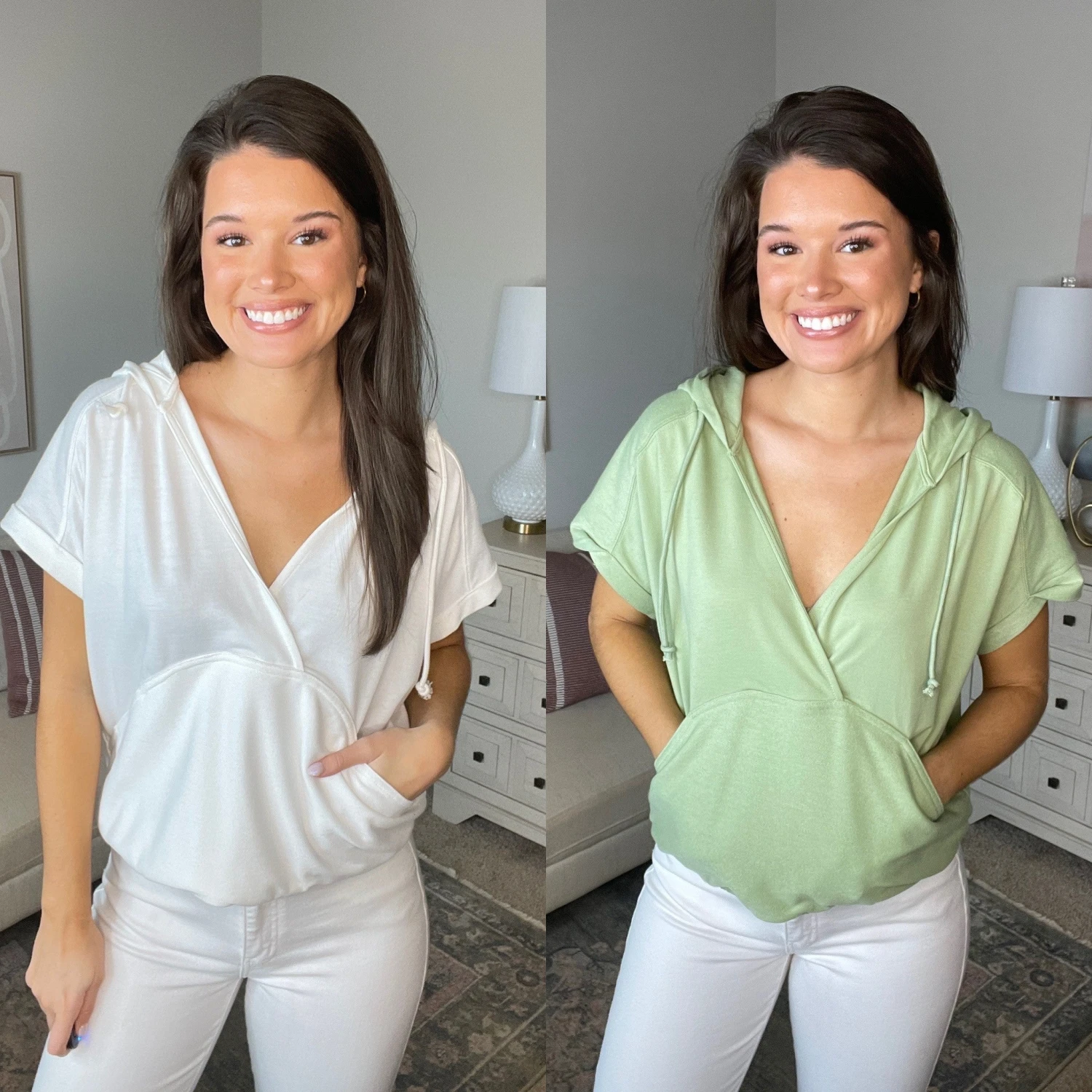 Features: V Neck, French Terry, Pullover, Hood, Front Pockets, Cuffed Short Sleeves