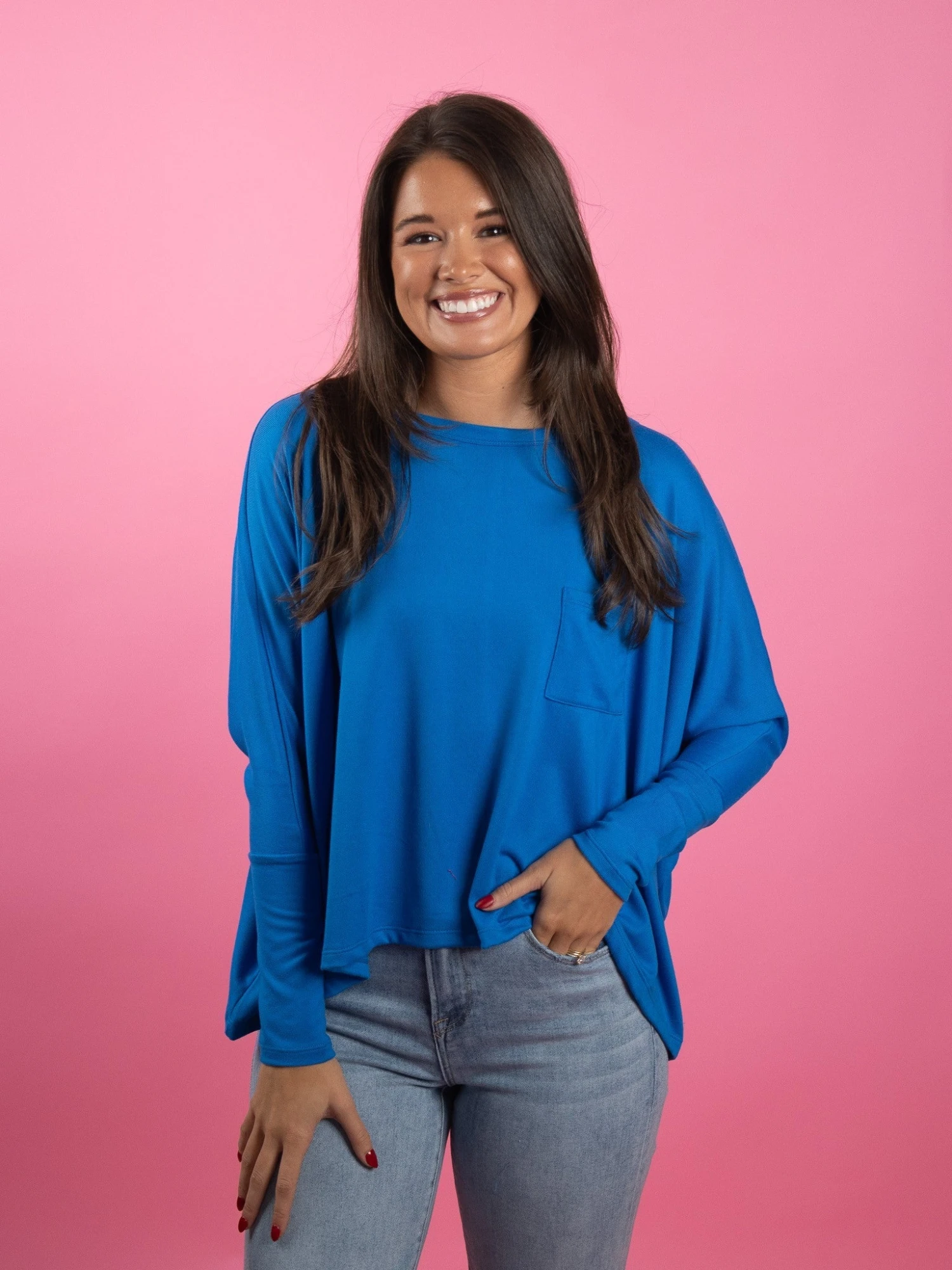 Features: Solid Print, Round Neck, Front Pocket, Long Dolman Sleeves